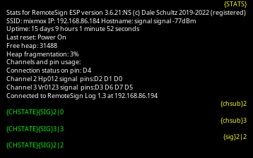 Will tell you information about the RemoteSign such as its version, how long a RemoteSign ESP has been running, the channels it has defined and what other software is connected to it. - {CHSUB}